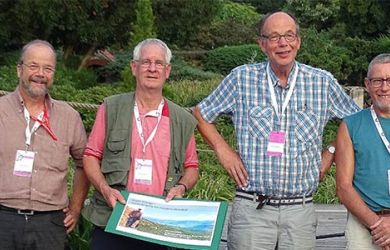 Umrahmt von seinen Amtsvorgängern Jakob Hokema, D-Schwäbisch Gmünd, (l.) und Jan Spruyt, B-Buggenhout (r.), erhielt Dr. Andres Altwegg (CH-Brugg) zum Abschied eine Einladung zur ISU-Exkursion 2019 vom neu gewählten ISU-Präsidenten Aad Vollebregt. -