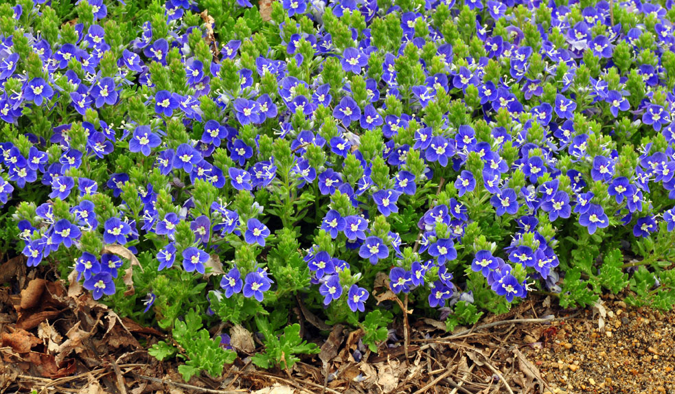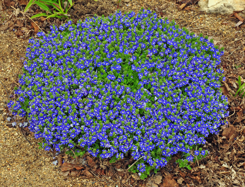 This creeping Veronica covers the ground completely. It grows spreading in a heigt of 15 cm. The intensive blue flower with white center cowers the leaves in the flowering time. `Tidal Pool´ is a Hybrid between Veronica armena and Veronica pectinata and prefers full sun or partial sun. Main flowering time: June-October