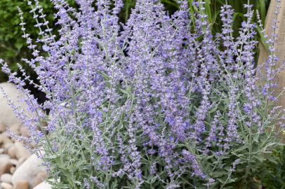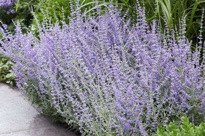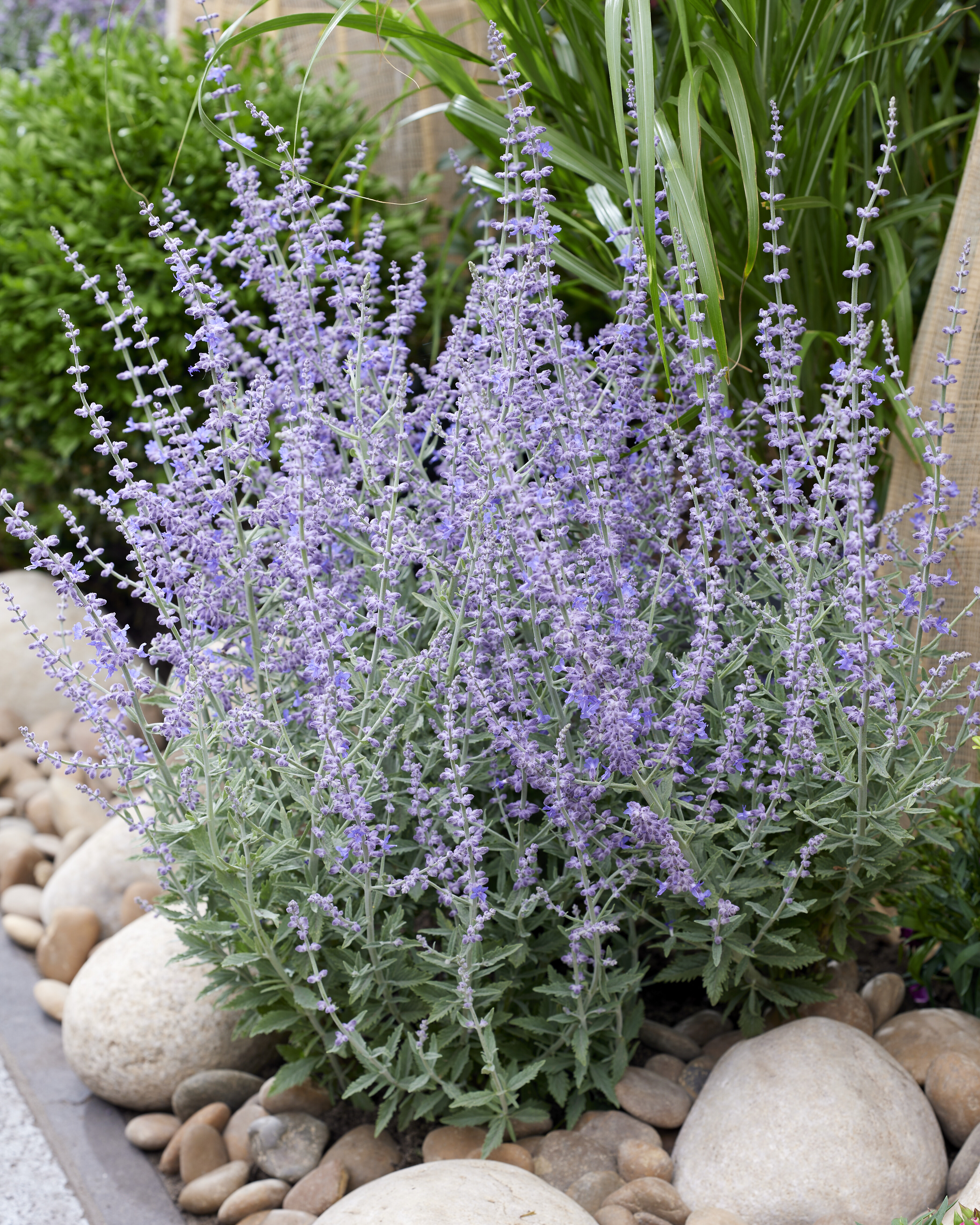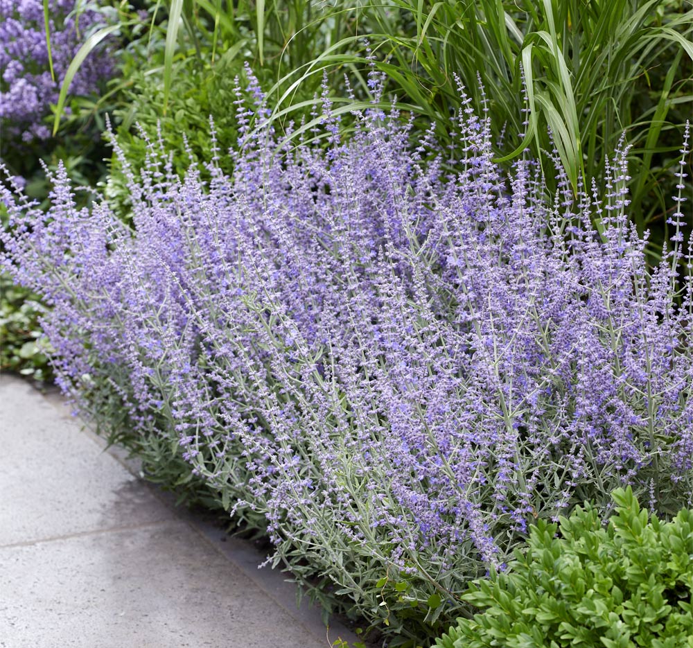 This is an early season blooming Russian sage with large, dense lavender-purple flower and grey-green aromatic foliage. The colour of flowers last through October. Very special is the dense, upright habit with strong stems up to a maximum height of 90 cm. It thrives in full sun- prefered-and semi-shade in well drained soil.