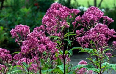 At 80 cm short stature with large, very pronounced umbels in grey-glinting purple (RHS 186C). Flowers July-October, elliptic leaves, dark green. More drought resistant than Eupatorium generally.