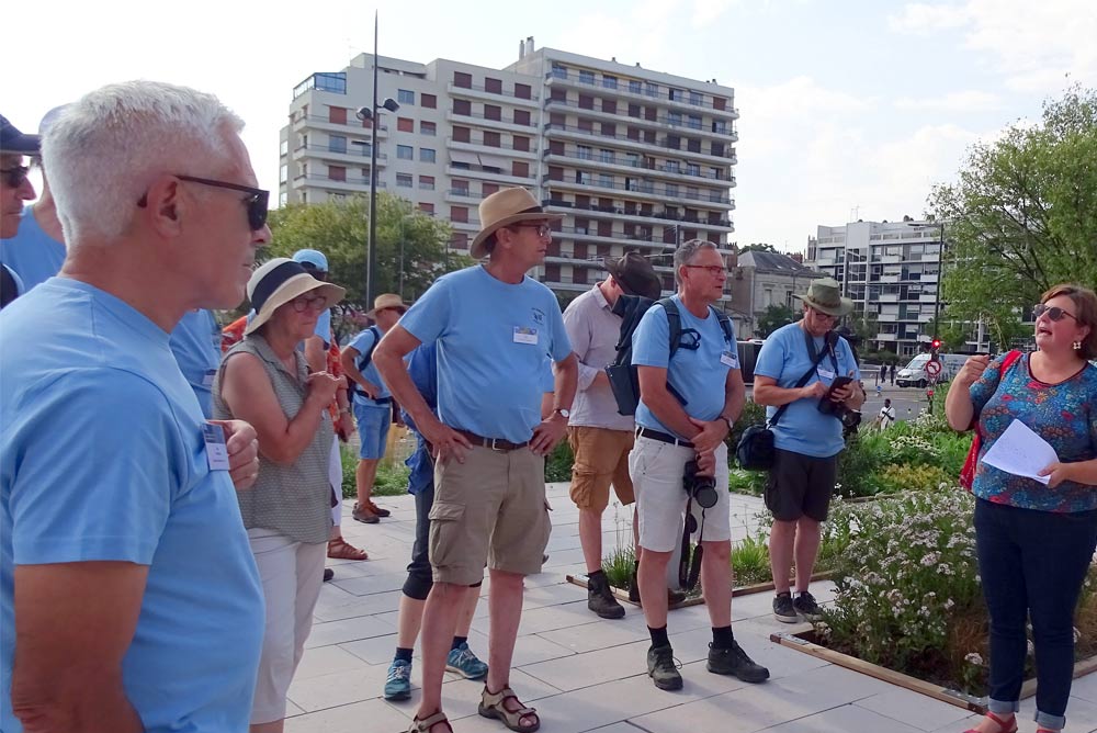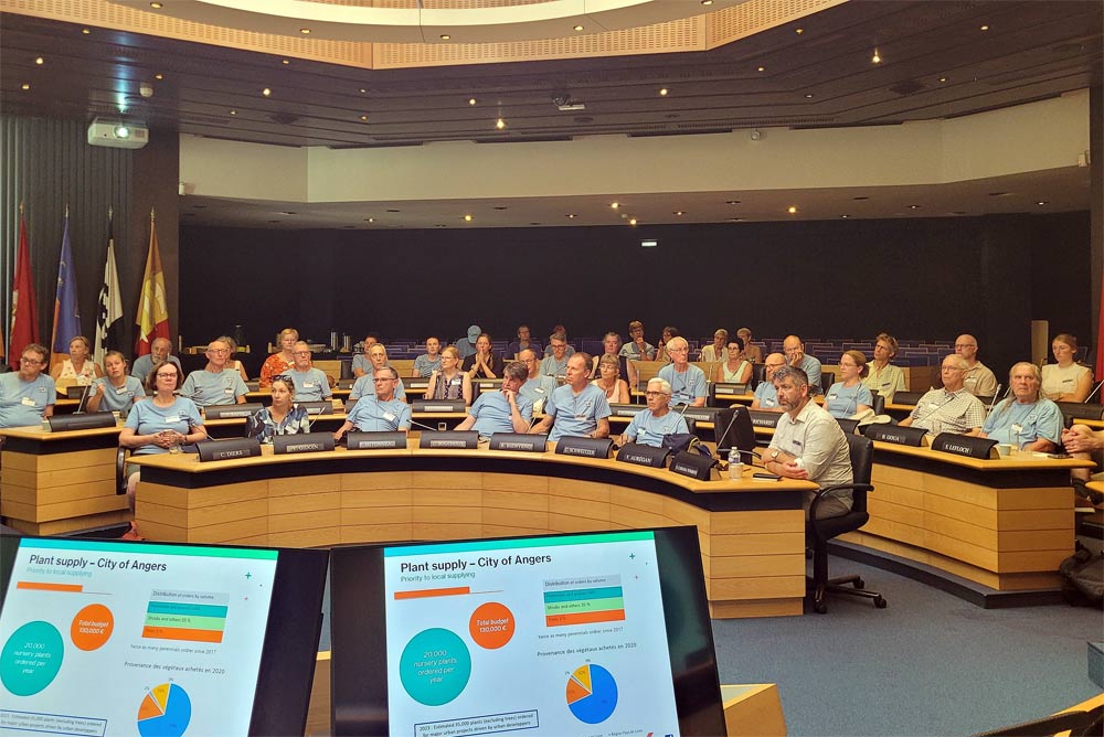 Close cooperation with perennial gardeners is necessary for both the planning of urban greening and planting, explained Alice Evain, head of the green space department of the city of Angers, during the visit of almost 60 participants of the ISU Summer Days in mid-August. The members of the International Hardy Plant Union (ISU) were invited to the city parliament for a presentation on the exemplary greening of Angers and a tour of the city. 600 mm of rainfall per year, high evaporation rates and increasing periods of drought present the city with a number of problems, which they are tackling with a comprehensive concept. They use the expertise of perennial plant expert David Gordon to select plants that are suitable for the climate. In production, the young plants are already grown in a special substrate with composted manure and fine gravel, among other things, and planted out in high density but very small pot sizes, explained Gordon. The suitability of the plants is regularly checked and optimized. Once they have grown, they are no longer watered. Even the narrowest strips along house walls or roadsides are used to plant cooling greenery and allow rainwater to infiltrate.
